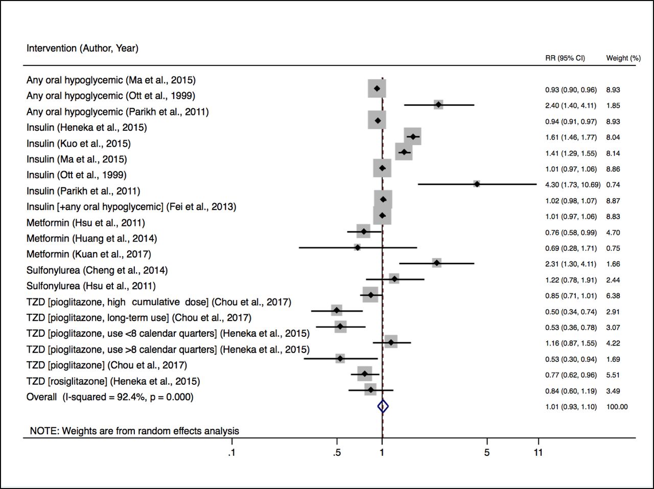 37の研究を体系的なレビューに、13の研究をメタ分析に加えた。 10件の研究では、血糖降下薬を、無治療と比較して、または以前の治療に対するアドオン療法と比較検討していた。 血糖降下薬による治療は、一般的に認知症発症リスクと関連していなかった(リスク比(RR)1.01; 95%CI 0.93〜1.10)。 しかしながら、薬剤クラス間では認知症リスクに対して差異があり、なかでもインスリン療法にリスク増加(RR 1.21; 95%CI 1.06〜1.39)が見出されたが、チアゾリジンジオン曝露ではリスク低下が認められた(RR 0.71; 95%CI 0.55〜0.93)。 重度の低血糖エピソードは、認知症リスク増加を伴った(RR 1.77; 95%CI 1.35〜2.33)。ほとんどの研究では、DM期間または重症度を考慮していなかった。結果